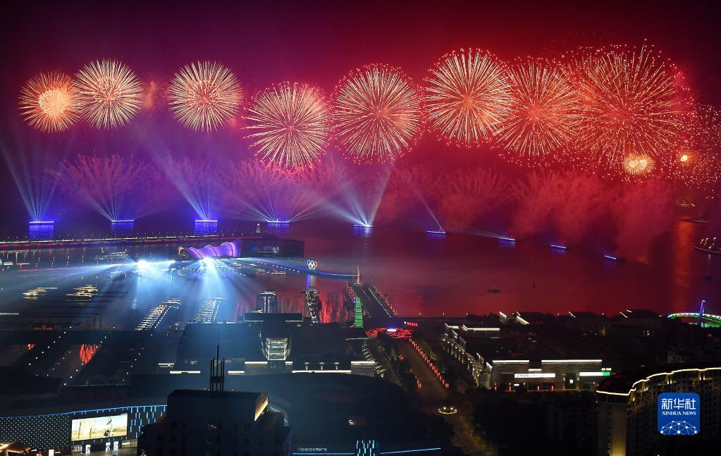 這是在青島舉行的《有朋自遠(yuǎn)方來》燈光焰火藝術(shù)表演(2018年6月9日晚攝)。2018年6月9日至10日,上海合作組織成員國元首理事會(huì)第十八次會(huì)議在青島召開。新華社記者 李紫恒 攝